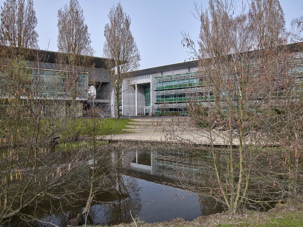Vue d'ensemble prise du sud : la "plage", la restauration scolaire et le bâtiment principal. Joël Y. Gautier, architecte, 1992.Immatriculation
