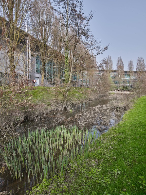 Vue densemble prise du sud-ouest : bras de décharge de la Vilaine et façades de la restauration et du bâtiment principal.Immatriculation