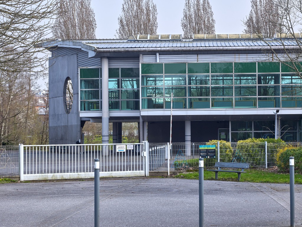 Restauration scolaire, partie nord : réfectoires (étage) et foyer des élèves (rdc). Vue prise de l'ouest. Joël Y. Gautier, architecte, 1992.Immatriculation