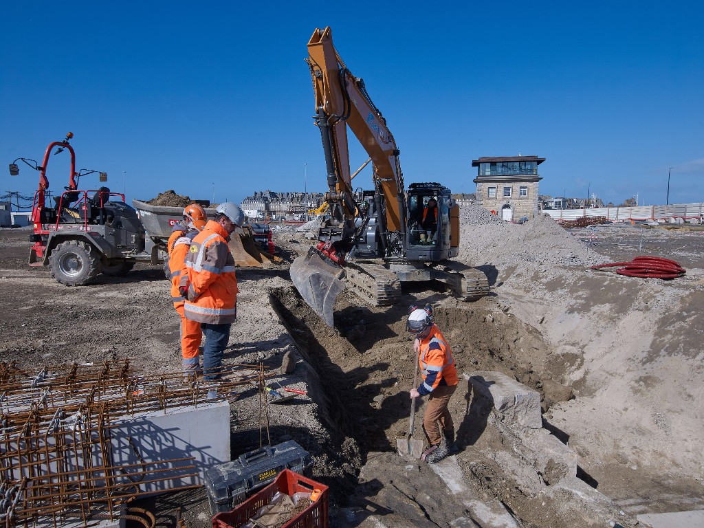 Vue de lopération archéologique réalisée sous la responsabilité de Ronan Louessard - INRAP avec un suivi scientifique et technique du DRASSM (couverture photographique du 11 mars 2026). En arrière-plan, le poste de commande de l'écluse du NayeImmatriculation