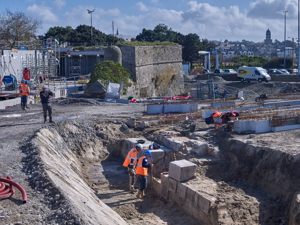 Vue de lopération archéologique réalisée sous la responsabilité de Ronan Louessard - INRAP avec un suivi scientifique et technique du DRASSM (couverture photographique du 11 mars 2026). En arrière-plan, le fort du NayeImmatriculation