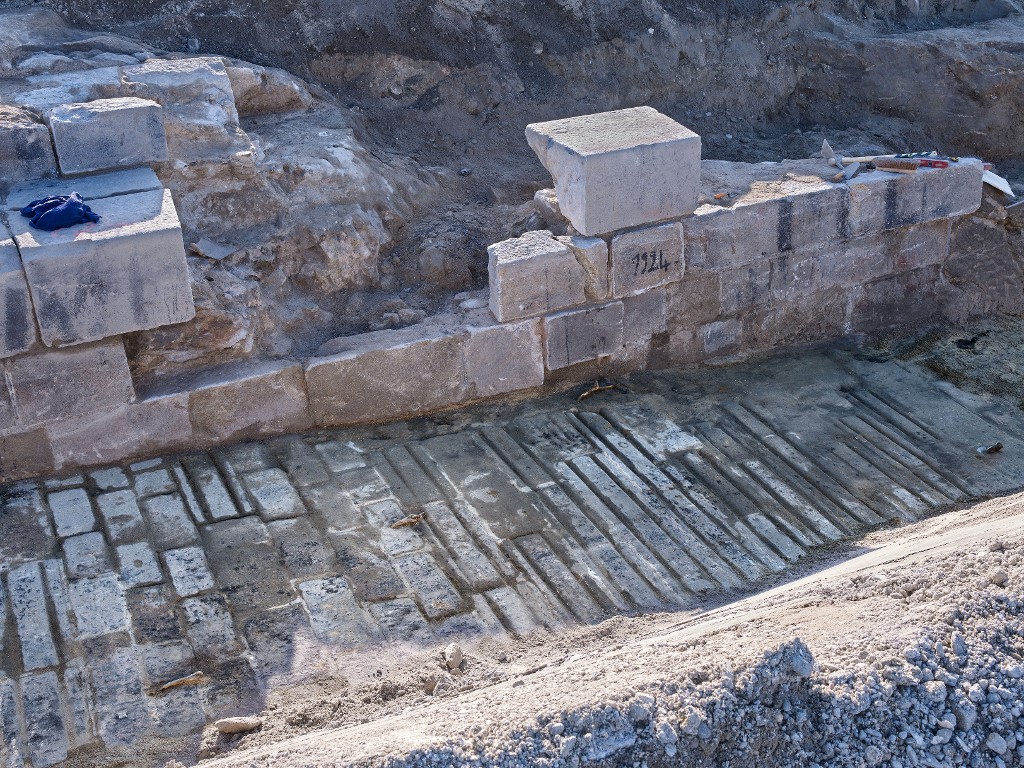 Vue de lopération archéologique réalisée sous la responsabilité de Ronan Louessard - INRAP avec un suivi scientifique et technique du DRASSM (couverture photographique du 11 mars 2026). La digue est datée de 1924, date des travaux de la grande écluseImmatriculation