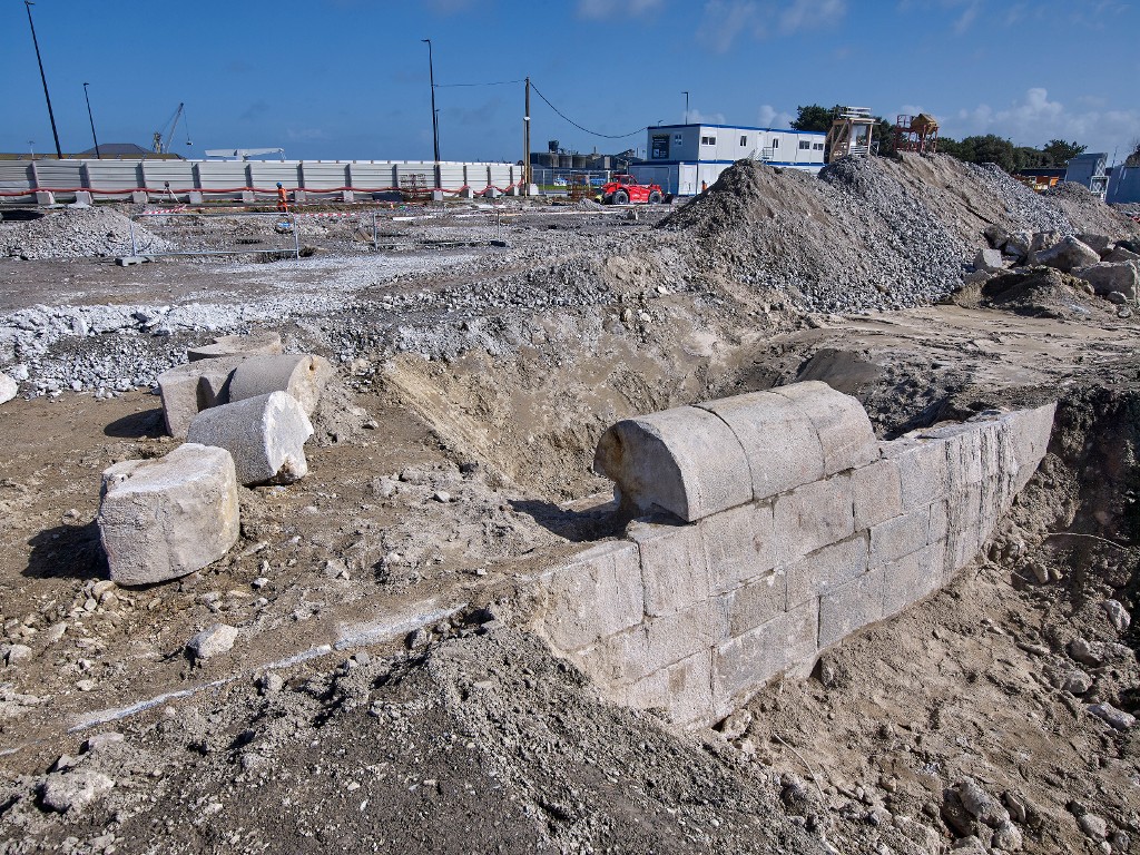 Vue de lopération archéologique réalisée sous la responsabilité de Ronan Louessard - INRAP avec un suivi scientifique et technique du DRASSM (couverture photographique du 11 mars 2026). Certains chaperons de la digue ont été retrouvés en place ou en vracImmatriculation
