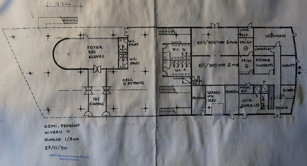 Plan du niveau 0 de la restauration scolaire et foyer des élèves. Joël Y. Gautier, 27/11/1990.Immatriculation