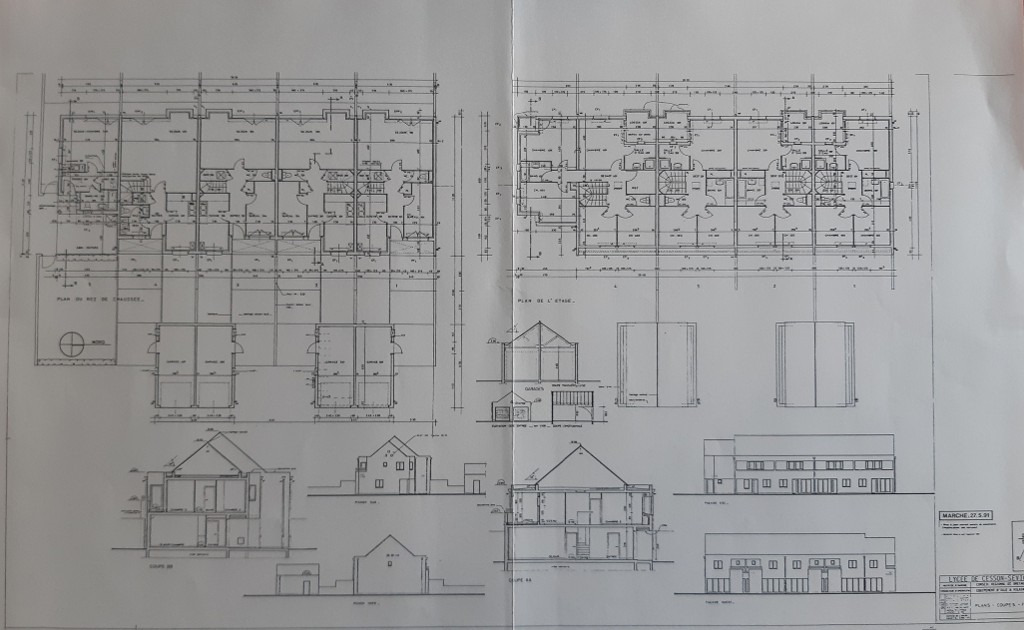 Plans, coupes et élévations des logements de fonction. Joël Y. Gautier, architecte, 1991.Immatriculation