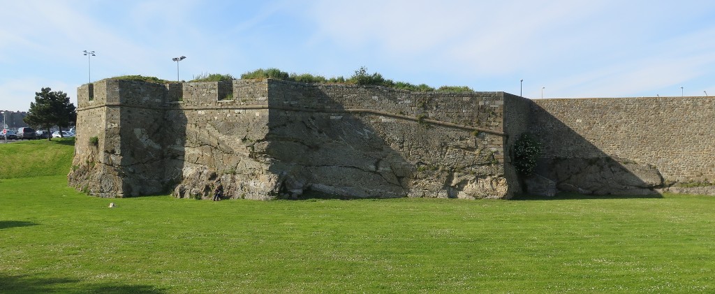 Vue générale depuis le sud (état en 2015). Fondée sur le rocher, cette partie du fort est montée en maçonnerie de moellon et en pierre de taille. Son parapet est percé de trois embrasures. A droite, le mur a été remontéImmatriculation