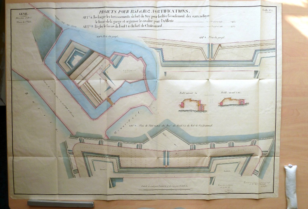 Plan des projets pour 1851 et 1852 : recharger les terrassements pour faciliter l'écoulement des eaux, nettoyer le fossé et organiser le cavalier pour l'artillerieImmatriculation