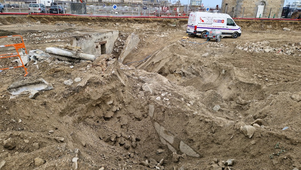 Vue de situation depuis le sud-est (couverture photographique du 17 décembre 2025). Au premier plan au centre, partiellement remblayés, les vestiges du quai de l'avant-port de Saint-Servan : il est construit en maçonnerie de pierre de taille de graniteImmatriculation