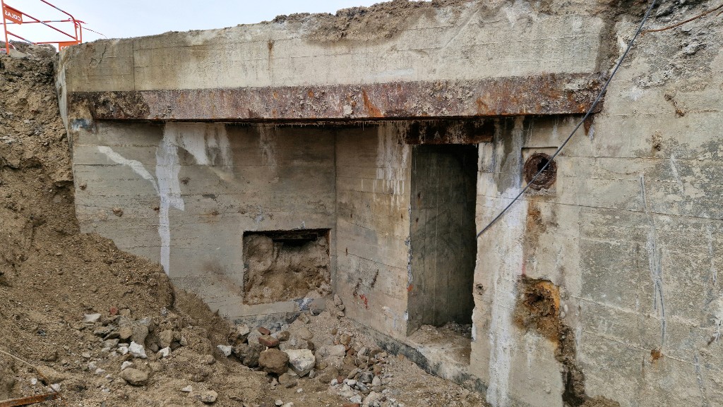 Vue de détail de l'élévation est : entrée sud flanquée par la caponnière (couverture photographique du 17 décembre 2025). L'ouverture de tir blindée de la caponnière est masquée par le remblaiImmatriculation