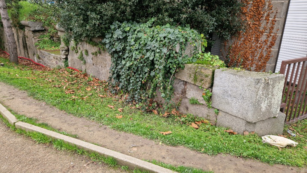 Vue des vestiges de l'escarpe à l'est, le long du rond-point du Naye (couverture photographique du 17 décembre 2025). En arrière-plan à droite, le bâtiment des DouanesImmatriculation