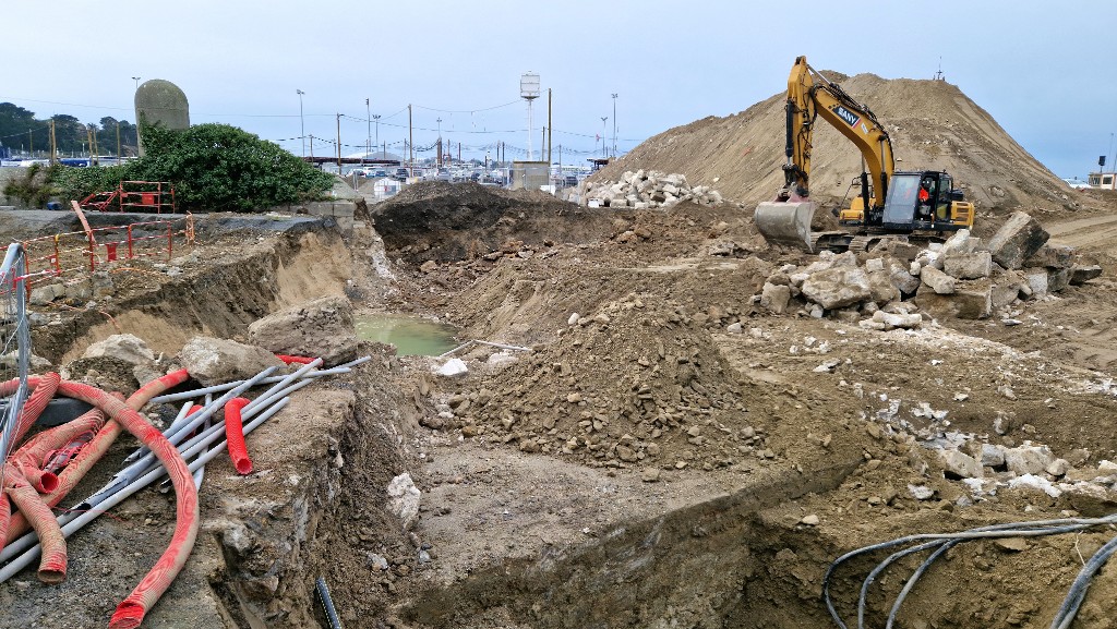 Vue de situation depuis l'est-nord-est (couverture photographique du 17 décembre 2025). Au premier plan, des vestiges maçonnés non identifiés en connexion avec l'avant-port de Saint-ServanImmatriculation