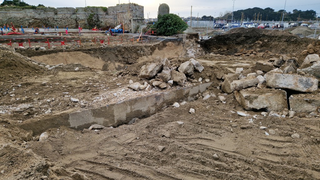 Vue de situation depuis le nord (couverture photographique du 17 décembre 2025). Au premier plan, les vestiges du quai de l'avant-port de Saint-Servan. Il est construit en maçonnerie de pierre de taille de graniteImmatriculation