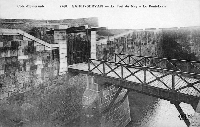 Vue de l'entrée du fort du Naye depuis le nord : fossé, pont-dormant, pile, pont-levis et mur crénelé, carte postale ELDImmatriculation