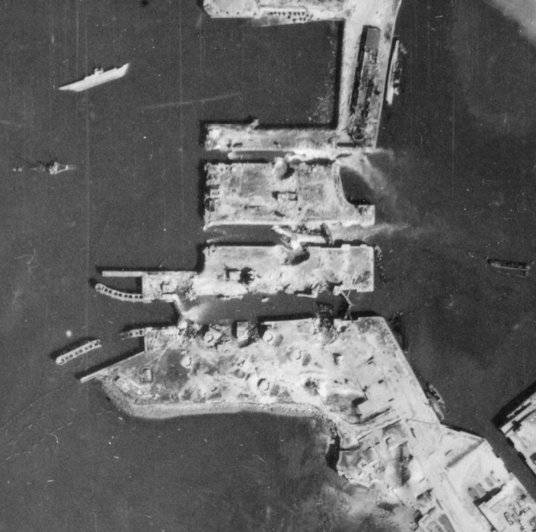 Vue aérienne verticale de Saint-Malo, 13 août 1944 (?). On peut observer le résultat de la destruction du port par l'occupant dans la nuit du 7 au 8 août (collection : Institut national de l'information géographique et forestière ?)Immatriculation