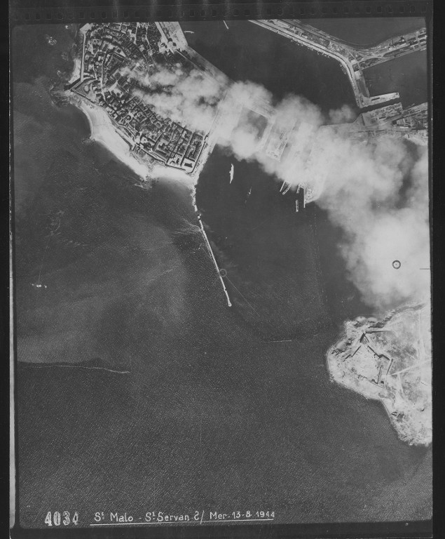 Vue aérienne verticale de Saint-Malo, 13 août 1944. On peut observer le résultat de la destruction du port par l'occupant dans la nuit du 7 au 8 aoûtImmatriculation