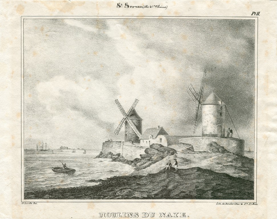 Vue des moulins et de la redoute du Naye par Hyacinthe Lorette, planche gravée extraite de l'Album Breton de 1832Immatriculation