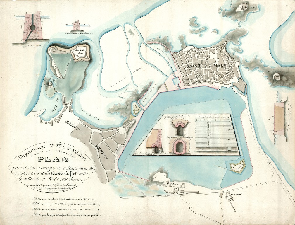Plan général des ouvrages à exécuter pour la construction d'un bassin à flot entre les villes de Saint-Malo et Saint-Servan par Charles Girard de Caudemberg, 12 septembre 1836. Au centre, le NayeImmatriculation