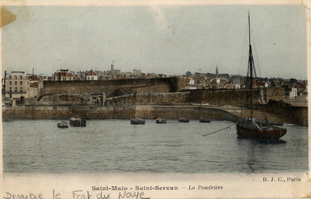 Vue générale depuis le nord, carte postale (B.J.C., Paris). De gauche à droite, on distingue le fort du Naye (mur crénelé et pont levis) et l'avant-port avec digue et cale. En arrière-plan, la ville de Saint-Servan.