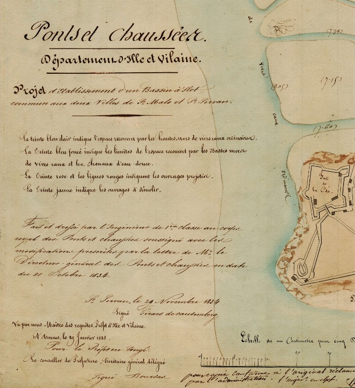 Légende du plan du projet d'établissement d'un bassin à flot commun aux deux villes de Saint-Malo et Saint-Servan par Charles Girard de Caudemberg, 29 novembre 1834Immatriculation