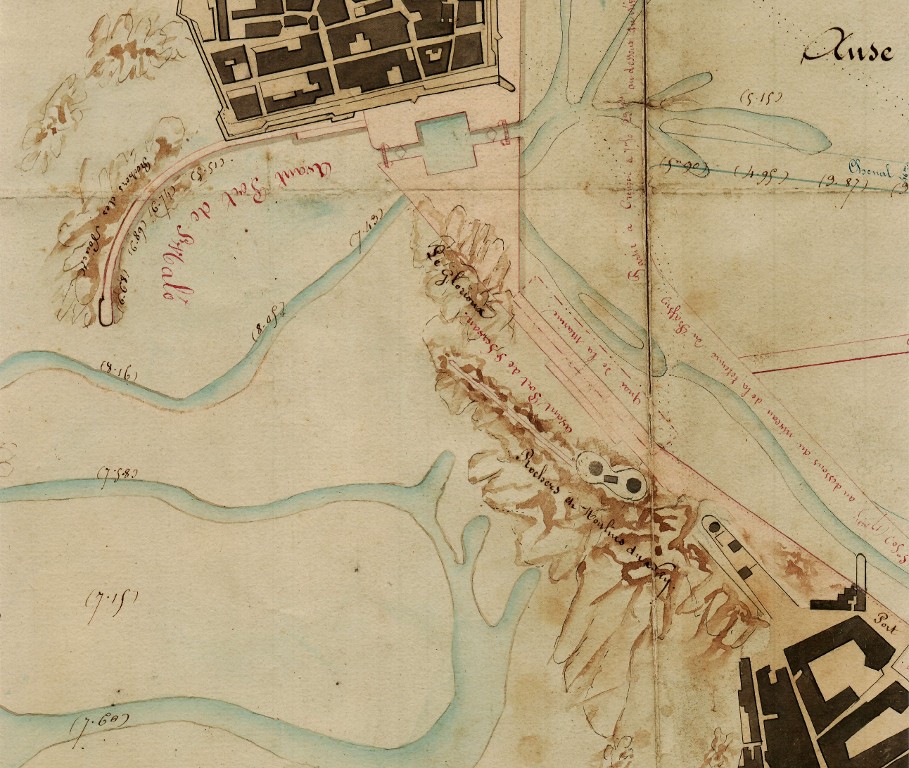 Détail du plan du projet d'établissement d'un bassin à flot commun aux deux villes de Saint-Malo et Saint-Servan par Charles Girard de Caudemberg, 29 novembre 1834. Au centre figure l'avant-port de Saint-Servan, les rochers et Moulins du roiImmatriculation