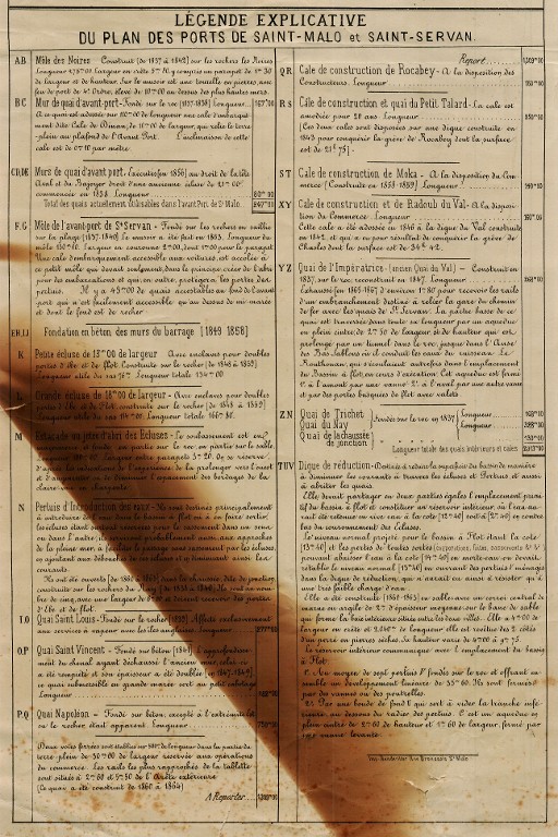 Légende explicative du plan des ports de Saint-Malo et Saint-Servan. Le môle de l'avant-port de Saint-Servan correspond aux lettres F:GImmatriculation