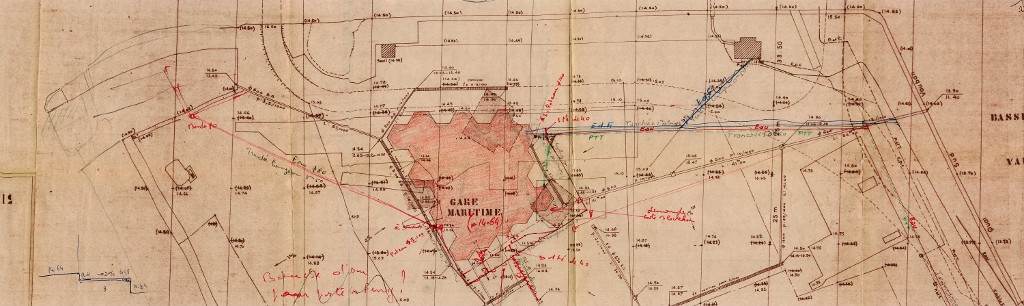 Détail du plan du terre-plein du Naye, 27 novembre 1975. Sous l'emprise de la gare maritime colorée en rouge sont figurés en brun trois bunkers appartenant à la batterie antiaérienne lourde du Naye ; à droite figurent l'emprise de deux autres bunkersImmatriculation