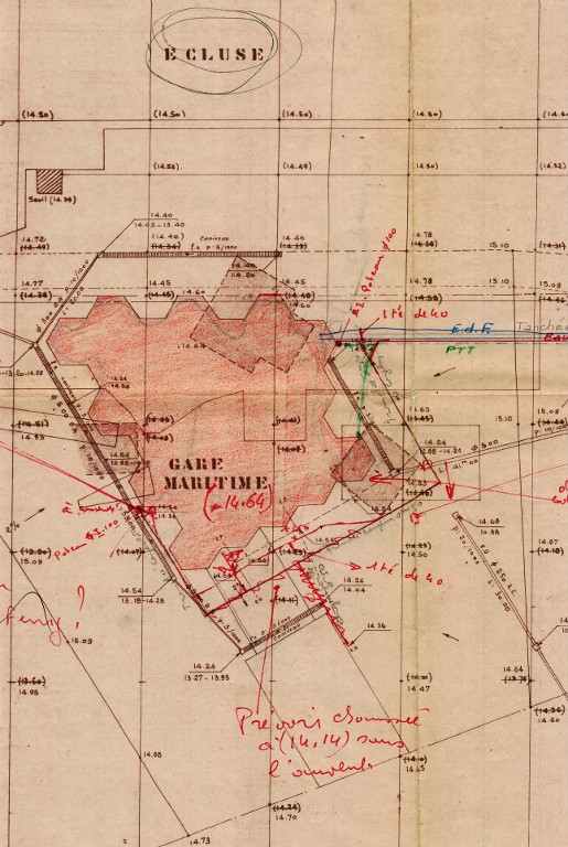 Détail du plan du terre-plein du Naye, 27 novembre 1975. Sous l'emprise de la gare maritime colorée en rouge sont figurés en brun trois bunkers appartenant à la batterie antiaérienne lourde du NayeImmatriculation