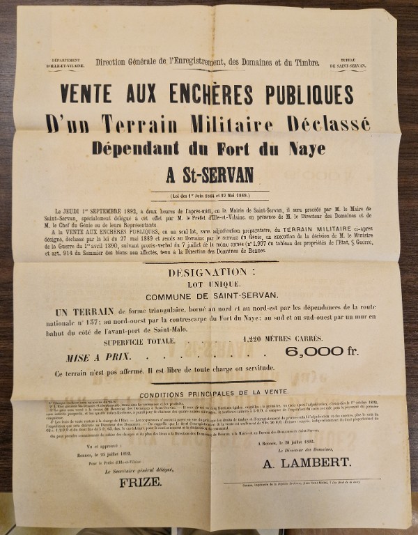 Affiche de la vente aux enchères publiques d'un terrain militaire déclassé dépendant du fort du Naye à Saint-Servan, 1892Immatriculation