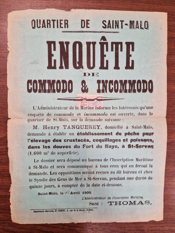 Affiche de l'enquête de commodo et incommodo pour un établissement de pêche pour l'élevage des crustacés, coquillages et poissons dans les douves du fort du Naye à Saint-Servan, 1er avril 1909Immatriculation