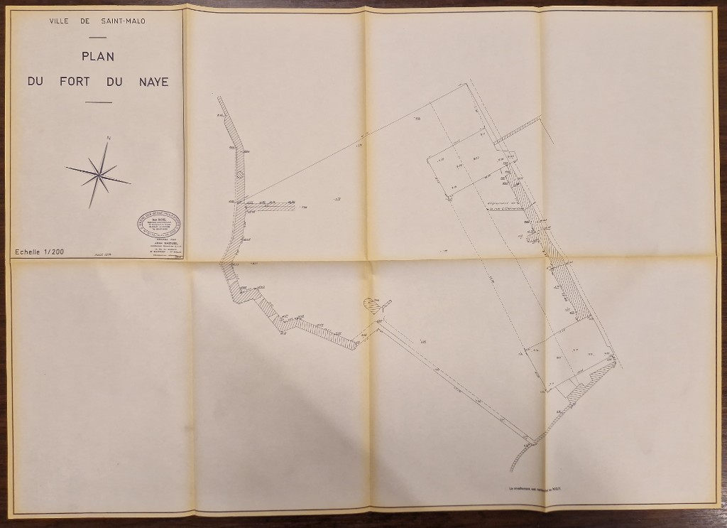 Plan du fort du Naye par Jean Baduel, ingénieur-géomètre à Saint-Servan - Saint-Malo, août 1974. Deux bunkers sont figurés dans l'emprise du fortImmatriculation