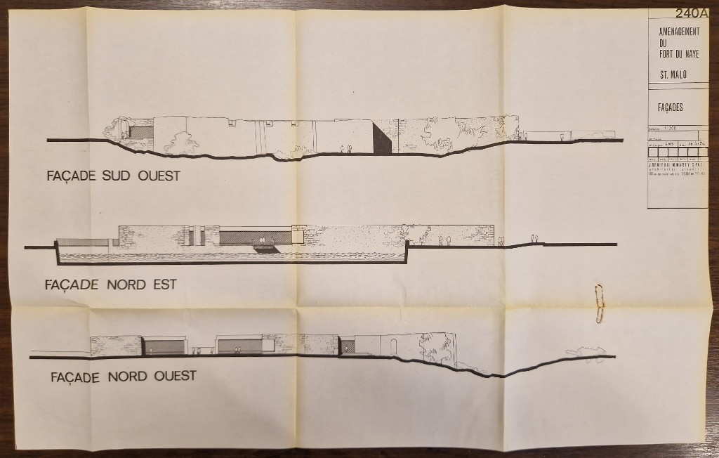 Permis de construire des aménagements du fort du Naye par le cabinet d'architectes - urbanistes J. Denieuil - M. Marty - G. Paoli, janvier 1977 : élévations des façades, 16 octobre 1974Immatriculation
