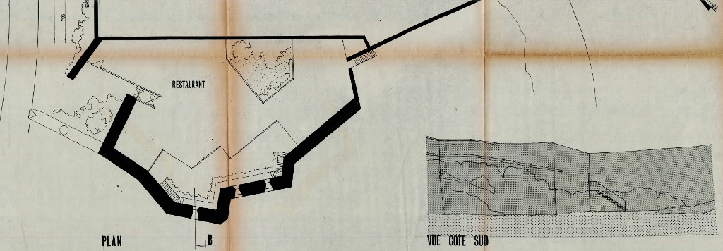 Permis de construire des aménagements du fort du Naye par le cabinet d'architectes - urbanistes J. Denieuil - M. Marty - G. Paoli, janvier 1977 : plan du restaurant et élévation sud, 10 novembre 1974Immatriculation