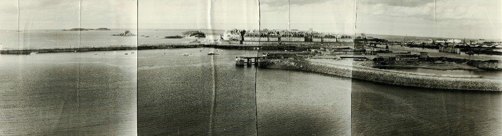 Vue panoramique du terre-plein du Naye depuis les Bas Sablons, vers 1966-1967 (Archives municipales de Saint-Malo). Le nouveau polder est en cours de remplissage par du sable de mer. A l'extrême droite, le fort du NayeImmatriculation