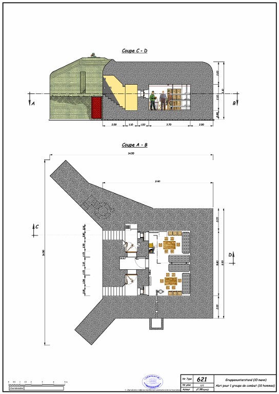 Plan et coupe d'un bunker-abri de type 621 pour un groupe de combat (Gruppenunterstand für 10 Mann)Immatriculation