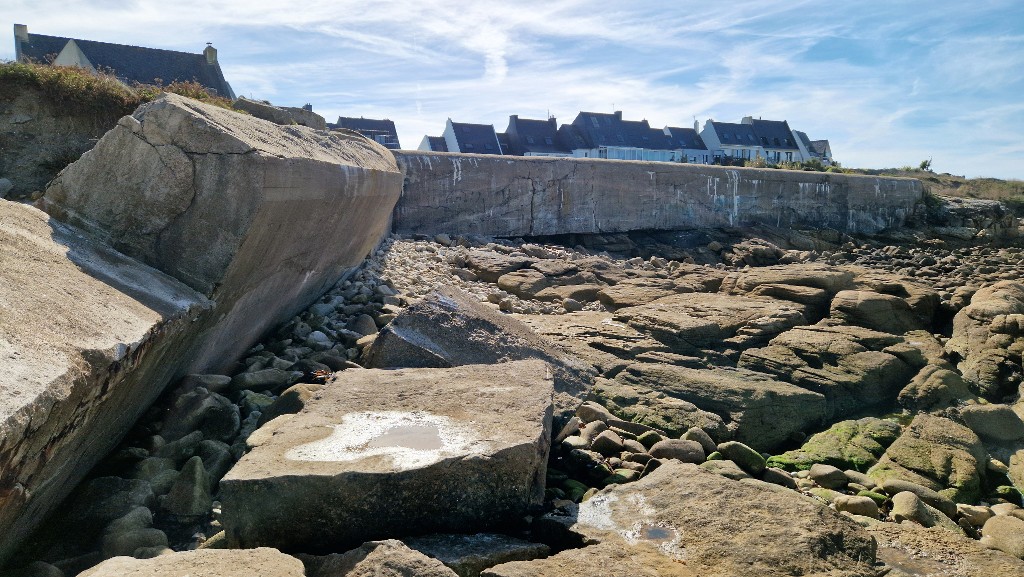 Vue générale au sud de la grève. Des sections de mur sont couchées sur la grève du côté de la mer. En arrière-plan : la pointe du CourégantImmatriculation