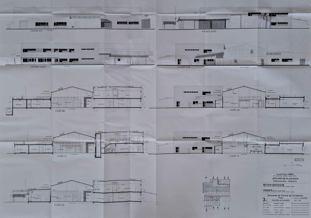 Plans, coupes et élévations de la deuxième extension des ateliers bateaux. Philippe Sinquin, architecte, 2005.Immatriculation