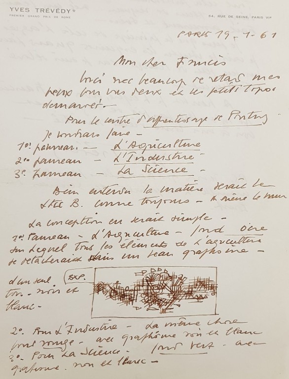 Lettre d'Yves Trévédy à Francis Pellerin (extrait), portant description de son projet de décoration pour le CET de Pontivy, 19 janvier 1961.Immatriculation